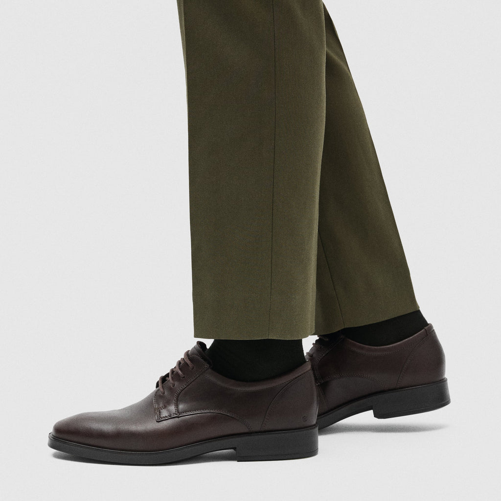 ECCO's Metropole Milan family of dress shoes has become a customer favourite, and it is easy to see why. This derby version has supple, premium leather uppers lined with both leather and textile to keep them light and breathable. The slightly square toe gives the foot more room to maneuver without being too boxy, and ECCO's Dual Fit system (multiple removable insoles) means you get several width options within the same pair. The combination PU/rubber midsole/outsole adds some extra cushion and stability. The plain styling makes these easy to dress up with a suit or dress down with business casual attire.